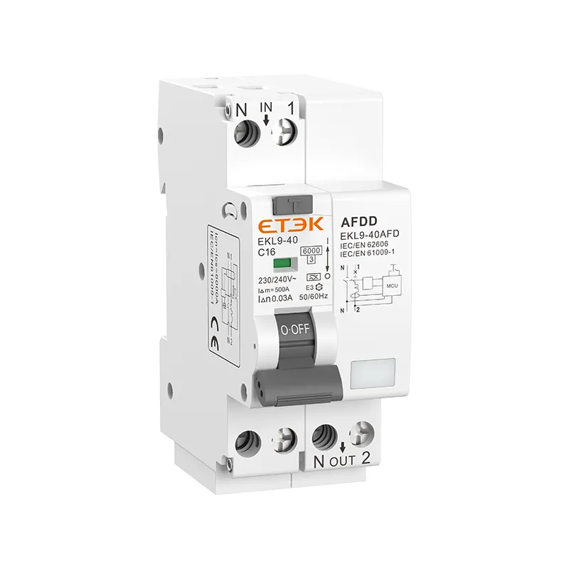 EKL9-40AFD est un dispositif de détection de défaut d'arc 1P+N (le pôle N peut être ON/OFF) avec RCBO intégré avec une capacité de coupure de 6 kA, avec un courant nominal jusqu'à 40 A et une sensibilité de 300 mA.