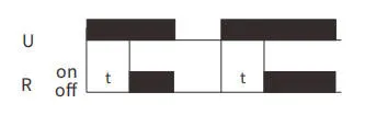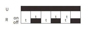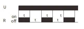 Lorsque la tension d'entrée U est appliquée, les contacts du relais R changent immédiatement d'état et la temporisation t commence. Une fois la temporisation t écoulée, les contacts reviennent à leur état initial pendant la temporisation t . Ce cycle se répète jusqu'à ce que la tension d'entrée U soit supprimée. Le commutateur de déclenchement n'est pas utilisé dans cette fonction.