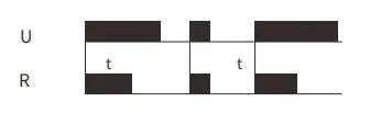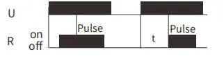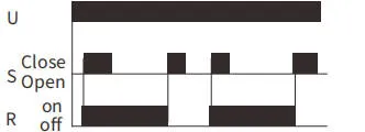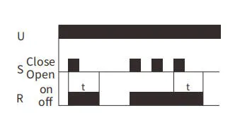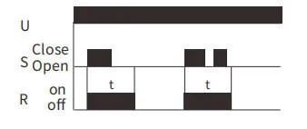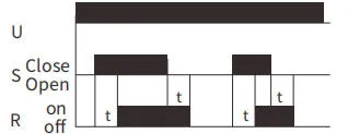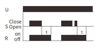 Lors de l'application de la tension d'entrée U , le relais est prêt à accepter le signal de déclenchement S. Lors de l'application du signal de déclenchement S , les contacts de relais R sont transférés et le temps prédéfini t commence. À la fin du temps prédéfini t , les contacts de relais R reviennent à leur état normal à moins que le signal de déclenchement S ne soit ouvert et fermé avant l'expiration du temps prédéfini t (avant l'expiration du temps prédéfini). Le cycle continu du signal de déclenchement S à une vitesse plus rapide que le temps actuel entraînera le maintien des contacts de relais R fermés. Si la tension d'entrée U est supprimée, les contacts de relais R reviennent à leur état de repos. |