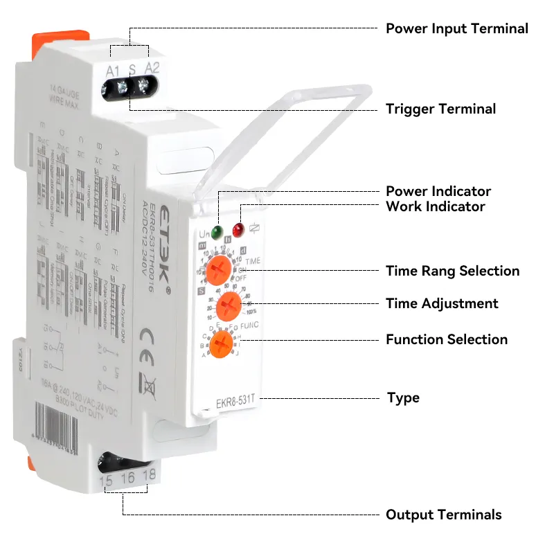 Lorsque le délai t est écoulé, les contacts R reviennent à leur état de repos. Si le déclencheur S est fermé avant la fin du délai t , le temps est réinitialisé. Lorsque le déclencheur S est ouvert, le délai recommence et les contacts du relais restent dans leur état excité. Si la tension d'entrée U est supprimée, les contacts du relais R reviennent à leur état de repos.