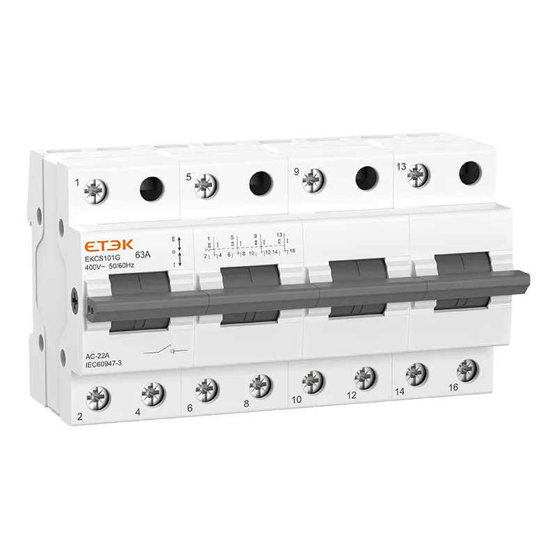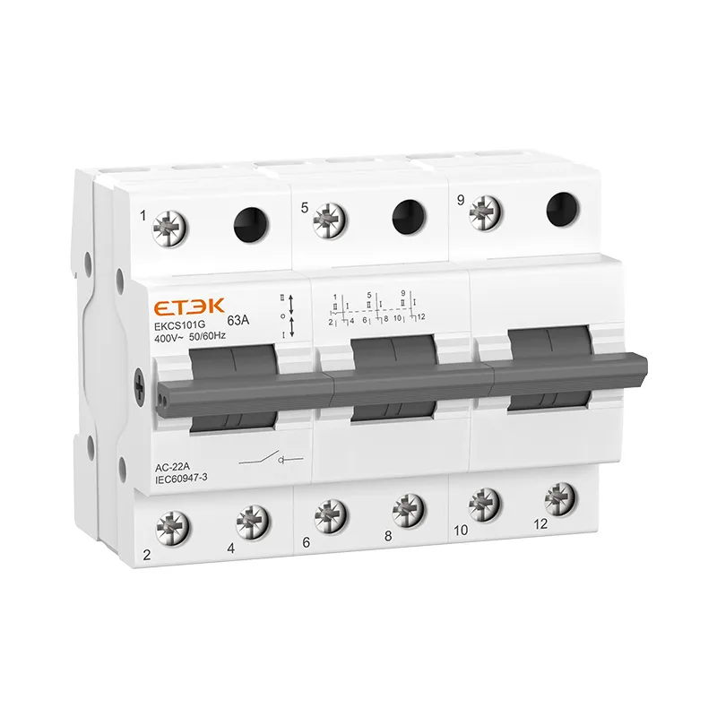 L'interrupteur d'isolement à conversion de puissance double monté sur rail EKCS101G a quatre fonctions de marche, d'arrêt, de conversion et d'isolement. Il peut être librement activé et désactivé entre deux charges transportées par un groupe de lignes ou sur deux sources d'alimentation. Il est utilisé pour la marche/arrêt et la commutation entre, en utilisant une installation sur rail standard DIN (35 × 7,5), la coque est fabriquée en moulage par injection PA66, avec des performances ignifuges élevées, c'est un produit idéal qui doit être utilisé pour la commutation et l'ouverture et la fermeture dans les équipements et circuits industriels. Le courant maximum peut atteindre 125 A, et il est pratique et sûr à installer et à câbler sur le rail de guidage.