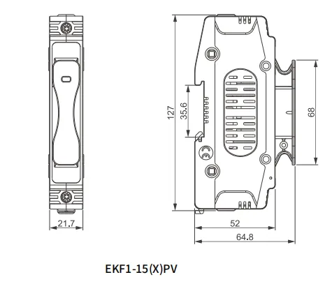 EKF1-15PV est un porte-fusible DC conçu pour la protection des chaînes photovoltaïques contre les courts-circuits et les surcharges. Il a une tension de fonctionnement nominale de DC1500V et un courant de fonctionnement maximal de 50A. Il est installé en toute sécurité à l'aide d'un rail DIN standard de 35 mm pour une compatibilité et une stabilité optimales.