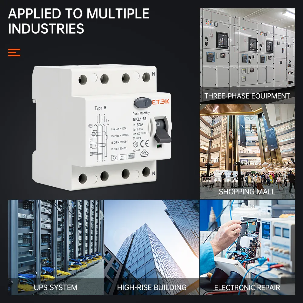 Le disjoncteur différentiel de type B EKL1-63B présente une conception d'apparence innovante, une structure compacte, une bonne fiabilité et une sécurité élevée. Les produits sont conformes aux normes IEC61008-1, IEC62423 et autres, et la certification du produit est complète ; ils garantissent des niveaux de protection plus élevés avec une continuité opérationnelle maximale dans toutes les conditions de travail. Pour cette raison, les disjoncteurs différentiels de type B sont considérés comme des dispositifs universels car ils offrent une protection contre toutes les formes d'onde de déclenchement répertoriées dans les normes EN 62423. Les disjoncteurs différentiels de type B peuvent assurer une sécurité maximale dans de nombreuses applications, telles que les bornes de recharge pour véhicules électriques, les grues et les ascenseurs et les éoliennes.