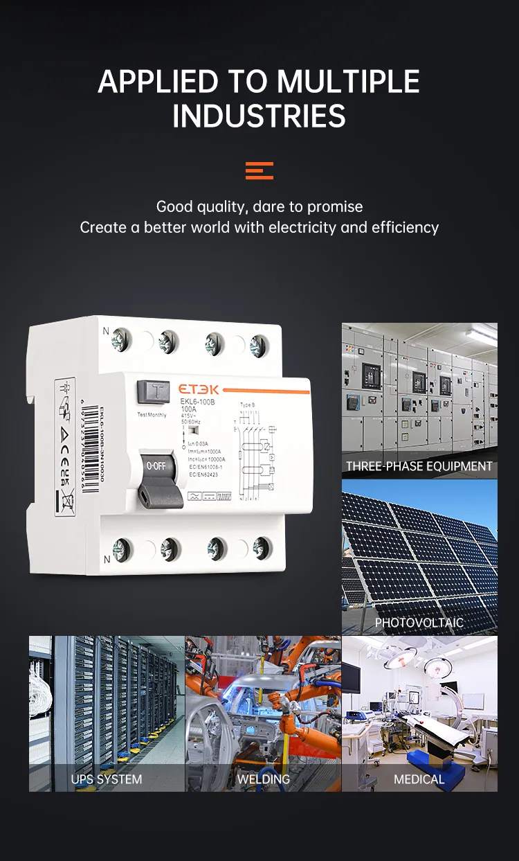 Le disjoncteur différentiel de type B EKL6-100B présente une conception d'apparence innovante, une structure compacte, une bonne fiabilité et une sécurité élevée. Les produits sont conformes aux normes IEC61008-1, IEC62423. Ils garantissent des niveaux de protection plus élevés avec une continuité opérationnelle maximale dans toutes les conditions de travail. Les disjoncteurs différentiels de type B peuvent assurer une sécurité maximale dans de nombreuses applications, telles que les bornes de recharge pour véhicules électriques, les grues et les ascenseurs, les centrales photovoltaïques et éoliennes, etc.