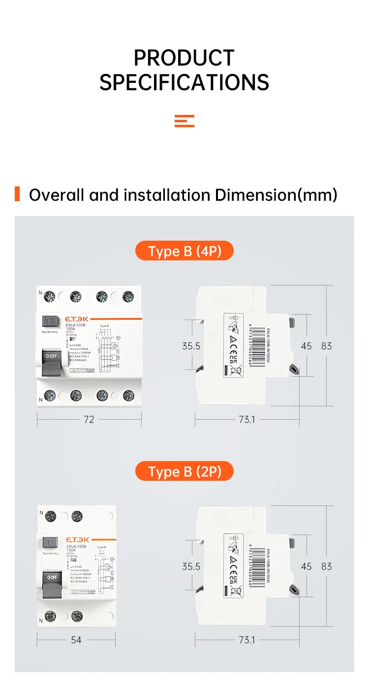 Le disjoncteur différentiel de type B EKL6-100B présente une conception d'apparence innovante, une structure compacte, une bonne fiabilité et une sécurité élevée. Ils garantissent des niveaux de protection plus élevés avec une continuité opérationnelle maximale dans toutes les conditions de travail. Les disjoncteurs différentiels de type B peuvent assurer une sécurité maximale dans de nombreuses applications, telles que les bornes de recharge pour véhicules électriques, les grues et les ascenseurs, les centrales photovoltaïques et éoliennes, etc.