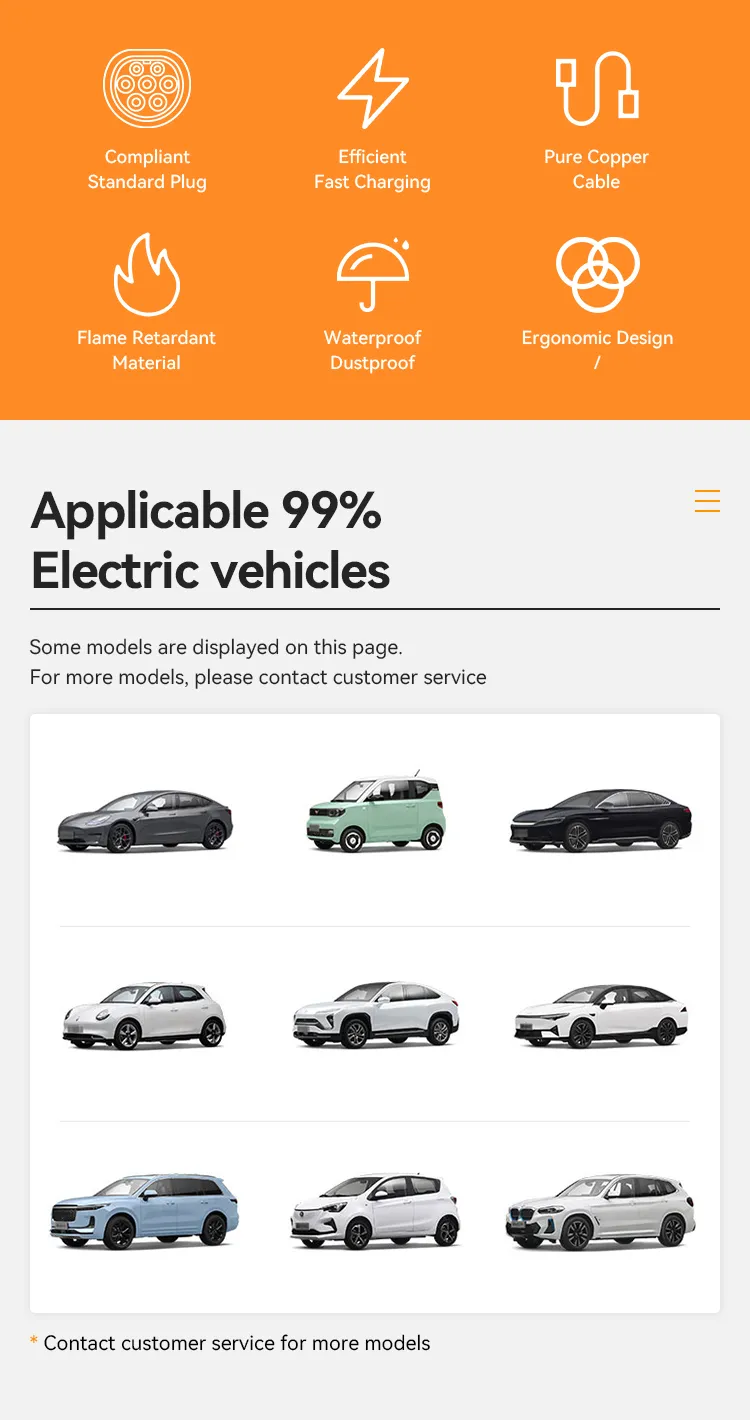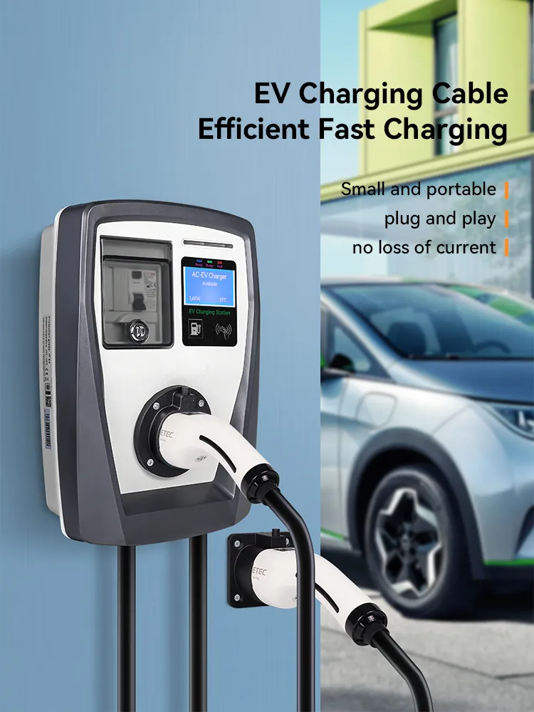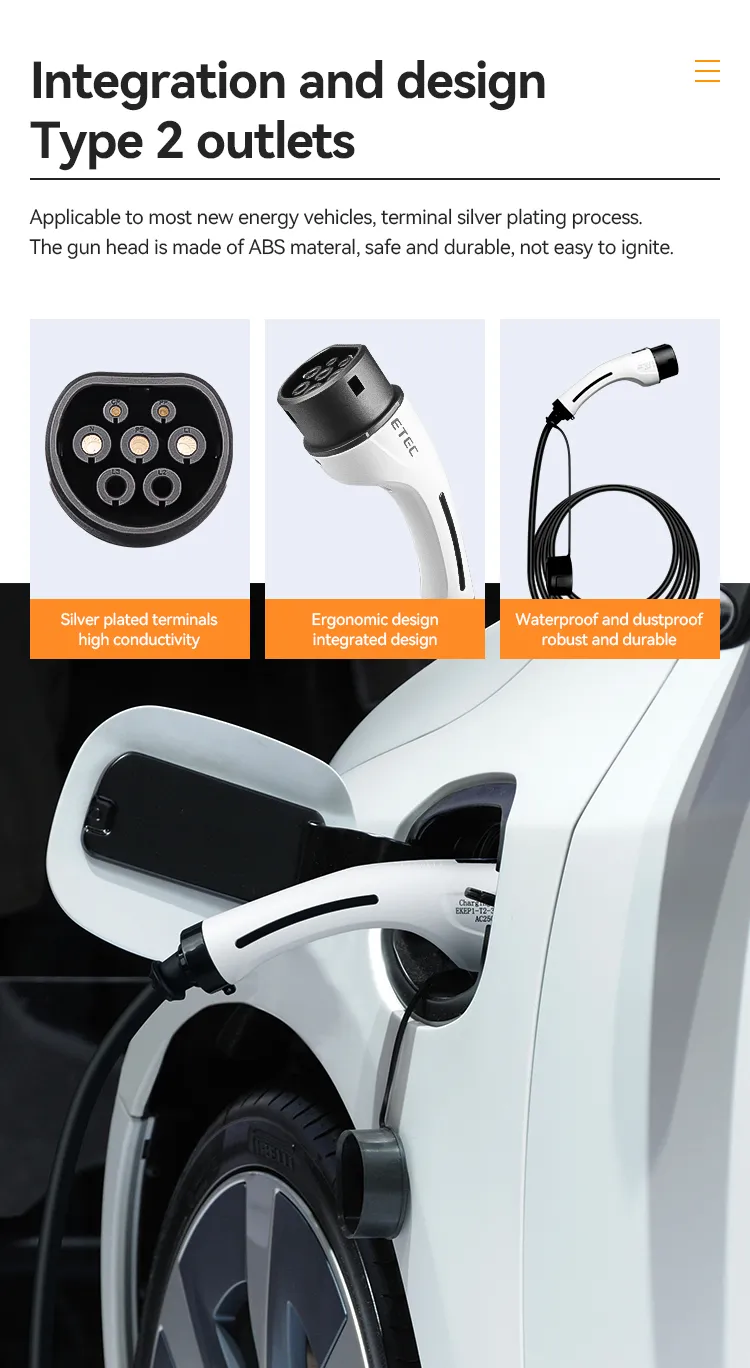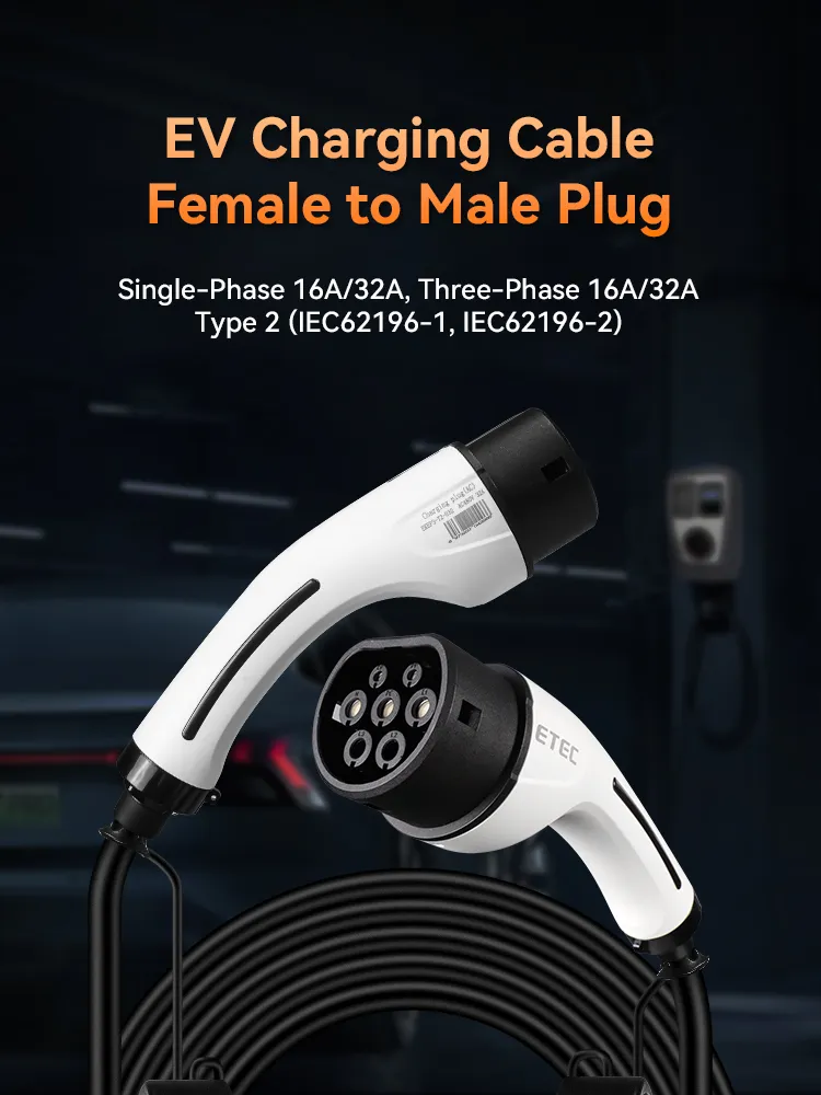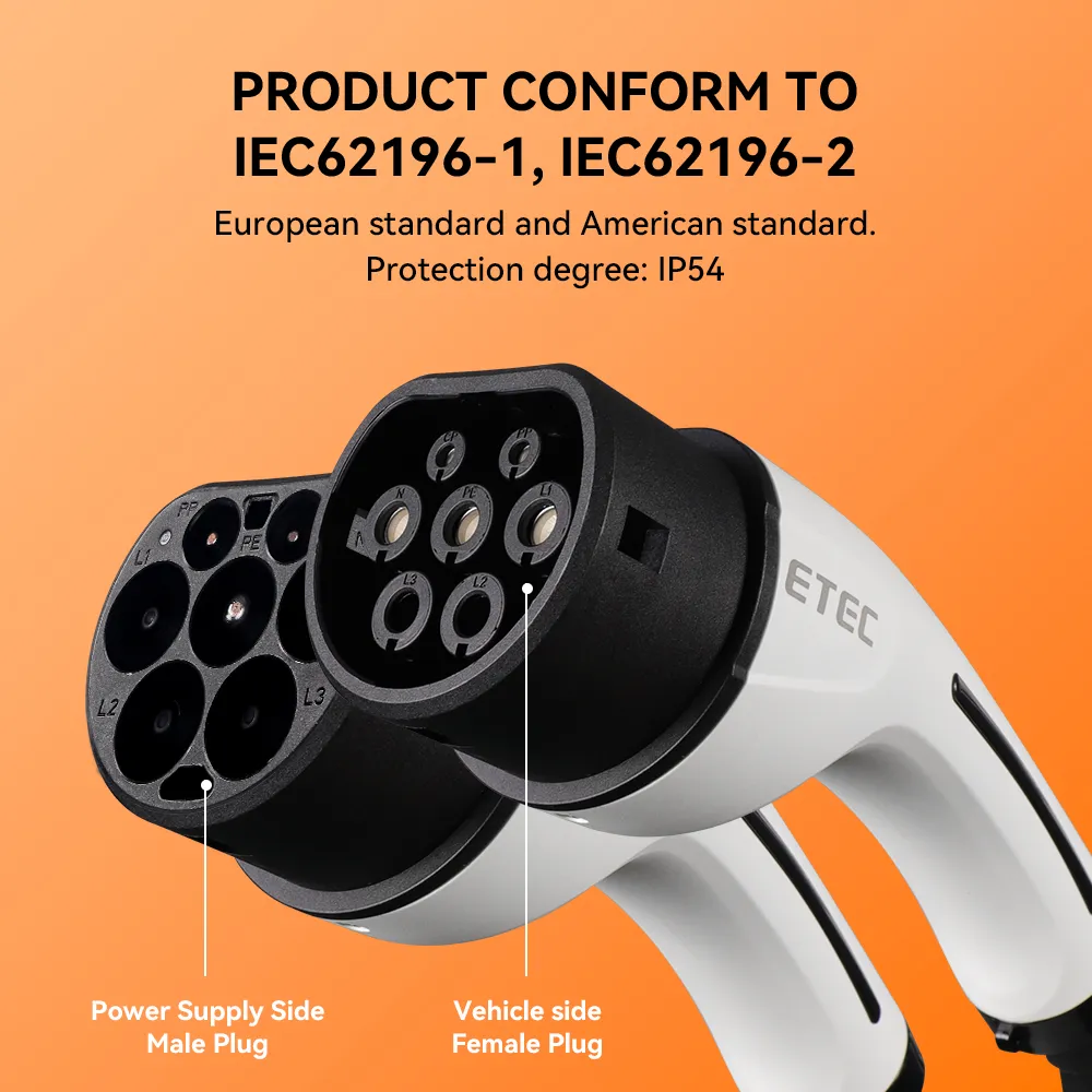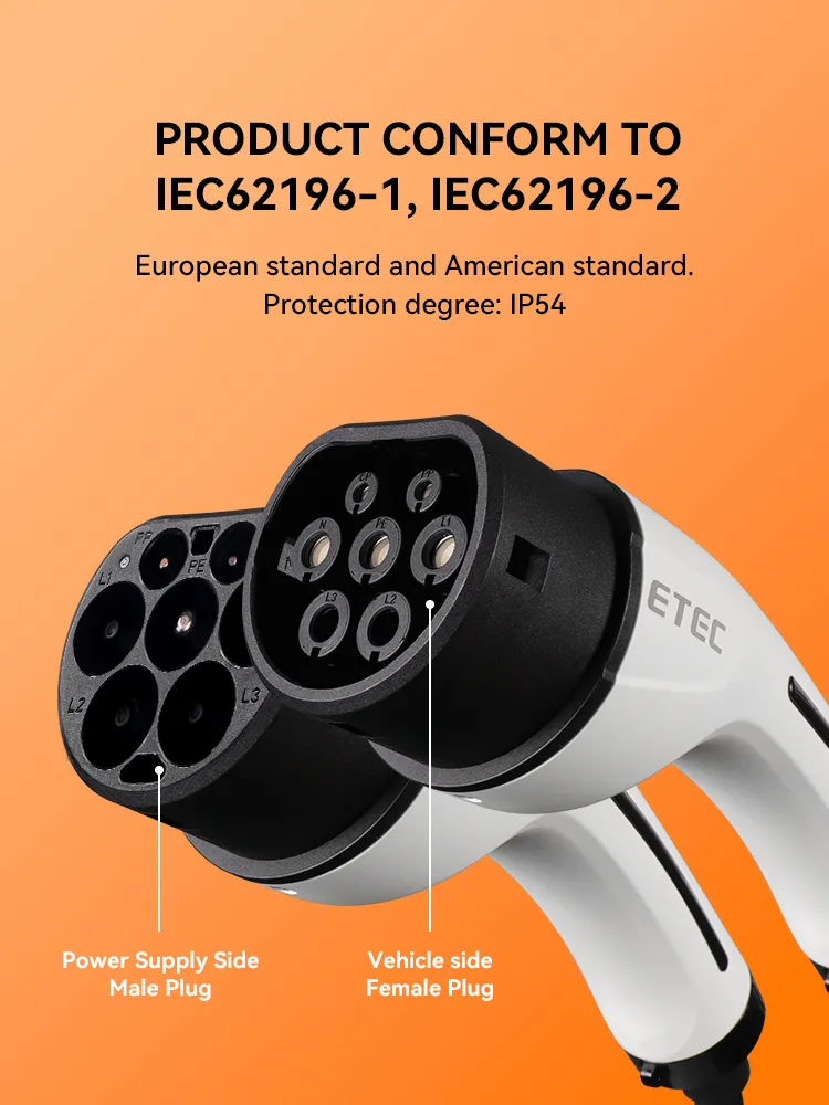 Câble de charge CA de type 2, version à double prise (type 2 vers type 2 ou câble d'extension femelle vers mâle), utilisé pour la connexion de l'extrémité de la station de charge à l'extrémité du véhicule électrique. Le produit est conforme aux normes de connecteur de charge IEC 62196-2. Il s'agit principalement de deux options de courant de 16 A et 32 A, qui sont divisées en versions monophasées et triphasées et par défaut d'un câble droit noir de 5 m.