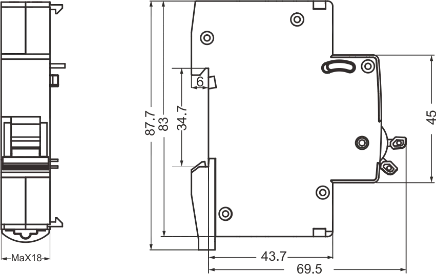 2. A monter sur le côté gauche du MCB/RCBO grâce à la goupille spéciale.
