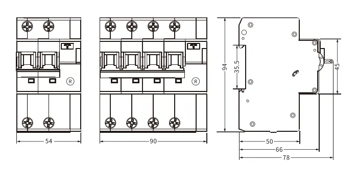 2P (1P + N) 3 modules, 4P (3P + N) 5 modules, ligne N avec déconnecté |