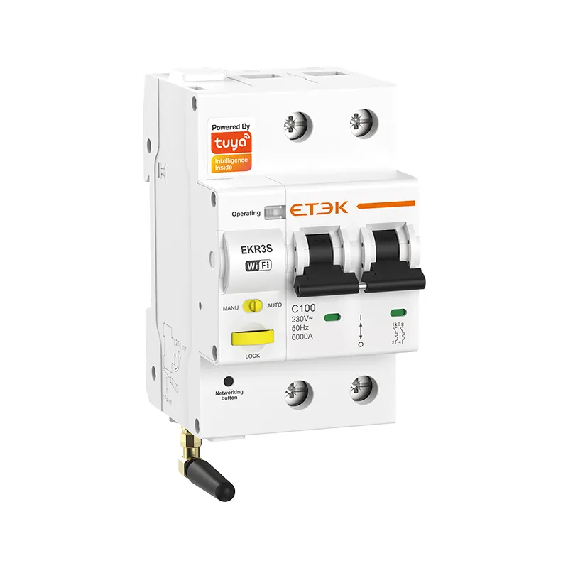 Le disjoncteur intelligent EKR3S est un appareil révolutionnaire qui utilise la technologie électronique pour réguler les disjoncteurs traditionnels. Il est capable de surveiller en temps réel les informations sur l'état de l'équipement, notamment la tension, le courant, la température, la consommation d'énergie et divers états de défaut tels que la surtension, la sous-tension, la surcharge et la surchauffe. Ces informations peuvent être signalées au client et le seuil de protection peut être défini par l'utilisateur. Ce produit est un appareil intégré indépendant qui permet aux utilisateurs de visualiser les informations sur l'appareil et de définir les paramètres associés de manière conviviale. Une fois connectée à Internet, l'application Tuya peut afficher les informations sur le produit, la télécommande, la synchronisation et d'autres fonctionnalités.
