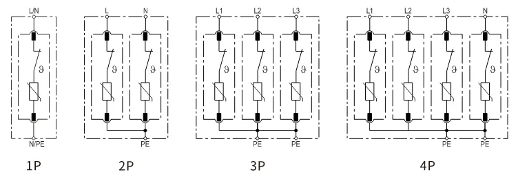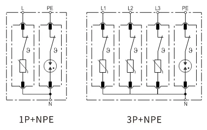 Le module N-PE et le module LN sont séparés mécaniquement pour éviter les combinaisons incorrectes de modules SPD enfichables et de prises conformes aux dispositions pertinentes du point 7.3.1 de la norme IEC61643-11. Par exemple, la cartouche du mode N-PE (composée d'un tube à décharge de gaz) peut être enfichée en mode LN (composé d'une varistance), ce qui peut conduire à des situations dangereuses comme un incendie.