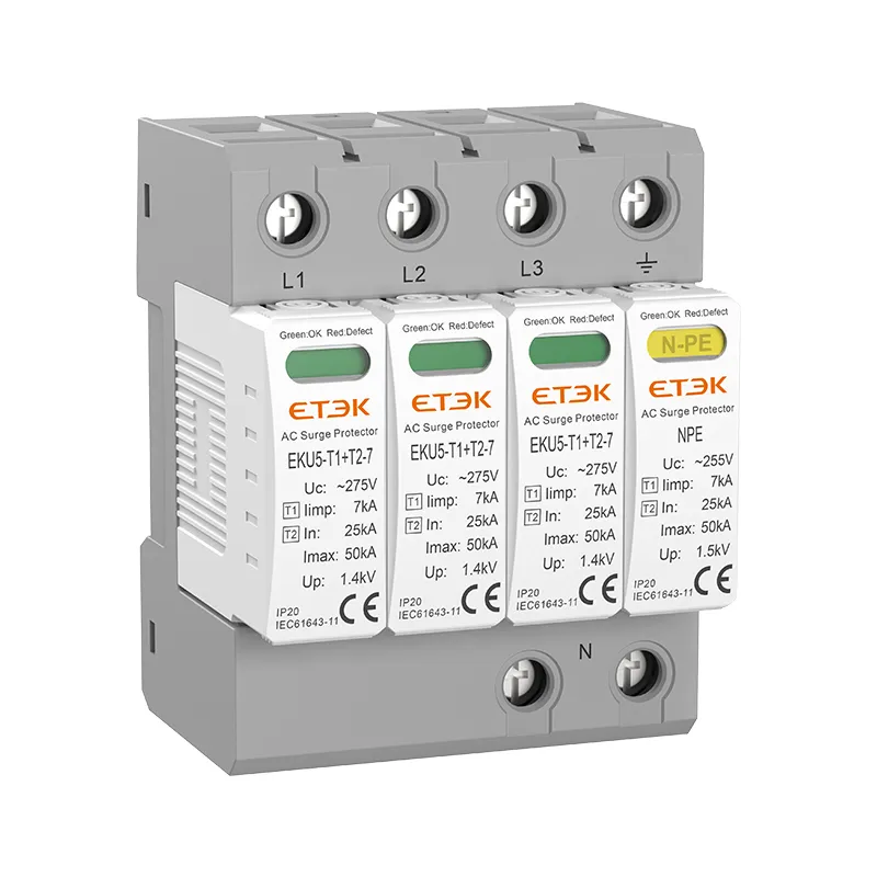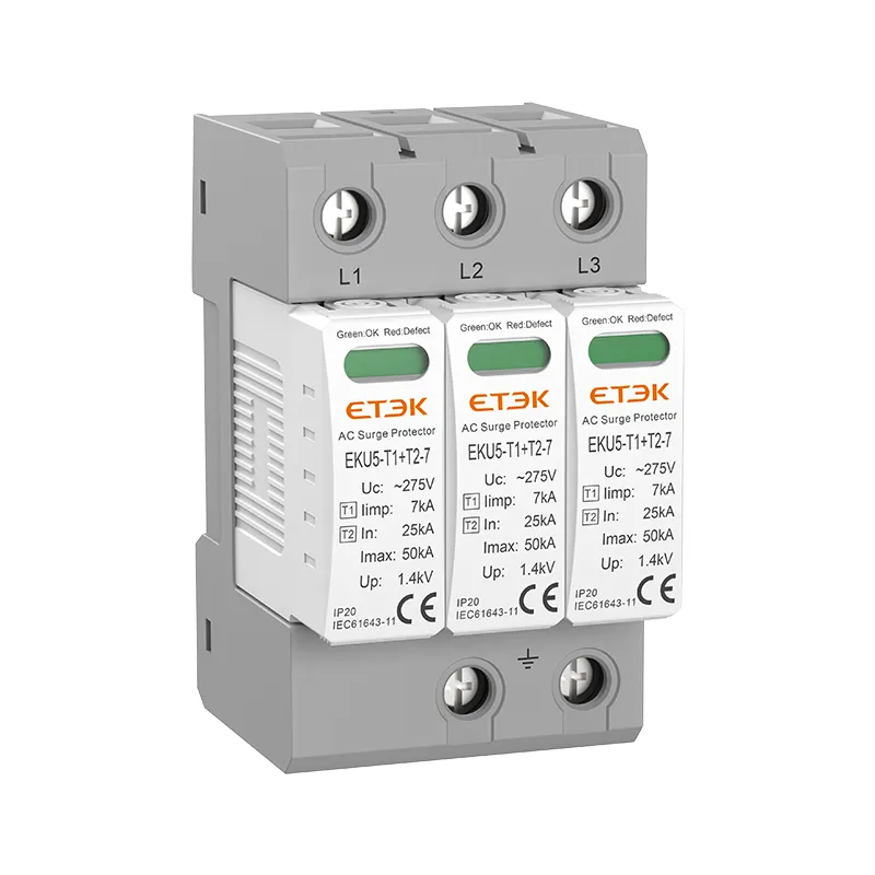 EKU5-T1+T2-7 est une série de dispositifs de protection contre les surtensions CA de classe I+II Iimp 7 kA conçus pour protéger contre les coups de foudre indirects et directs de faible intensité. Ces SPD sont équipés de varistances à oxyde métallique à haute énergie, garantissant un temps de réponse faible et des caractéristiques adaptées à la protection de classe I et II. La conception modulaire avec inserts enfichables permet un remplacement facile et rapide des modules de fonction au cas où le MOV atteindrait la fin de sa durée de vie en raison d'une intensité élevée ou de pics de surtension fréquents.