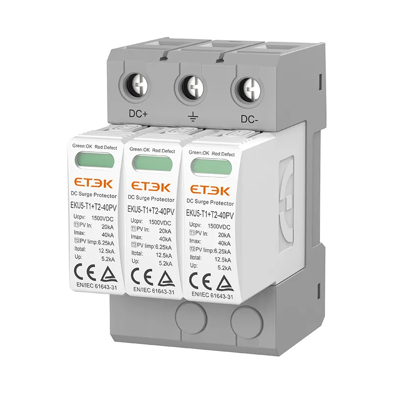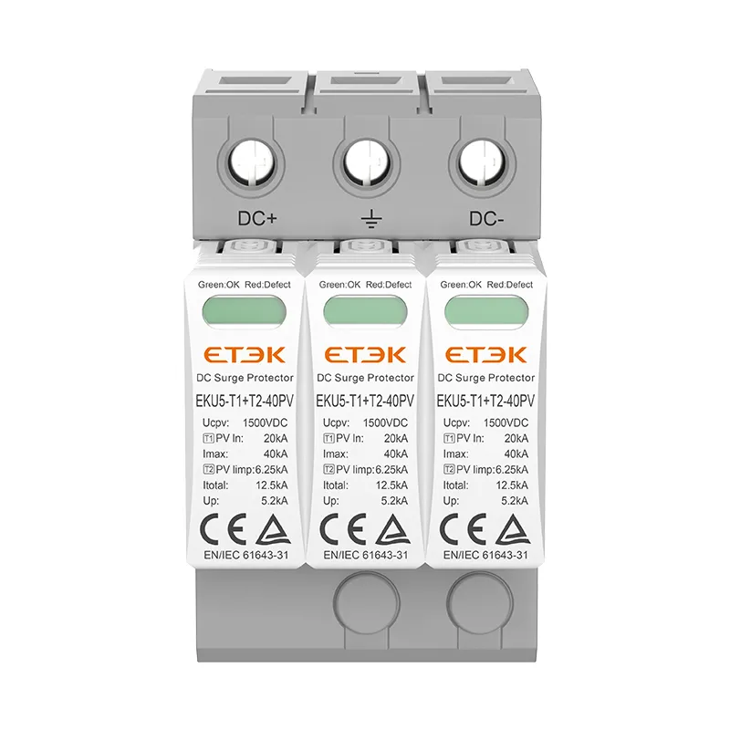 La série de parasurtenseurs CC EKU5 T1+T2 est conçue pour être utilisée dans les applications photovoltaïques (PV) jusqu'à 1 500 V. Ces dispositifs de protection contre les surtensions (SPD) sont conformes à la classification PV T1+T2 décrite dans la norme IEC 61643-31. La fenêtre d'indication avant permet aux utilisateurs de connaître l'état de l'appareil et le port de signal à distance peut fournir une indication et une alarme à distance. De plus, la conception du module enfichable facilite la maintenance et le remplacement ultérieurs.
